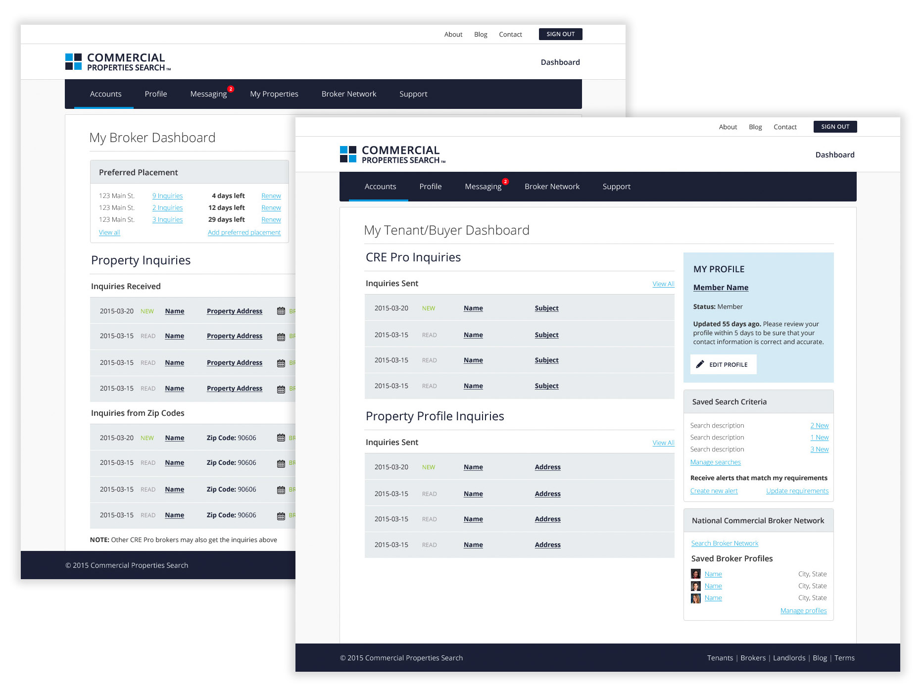 Broker and tenant dashboards: Showing inquiries, saved searches, and profile information.
