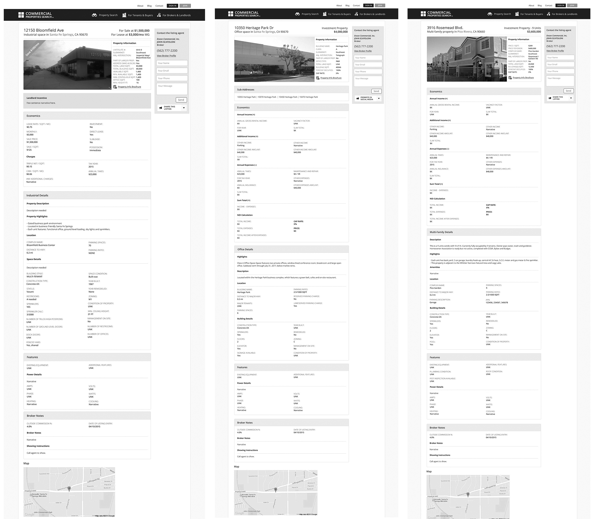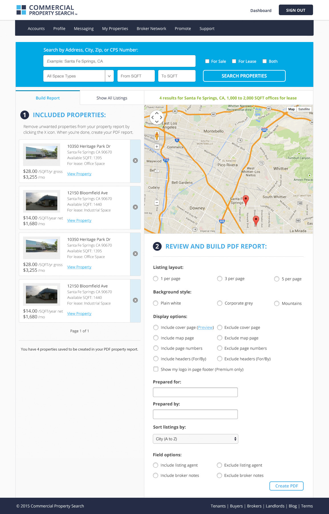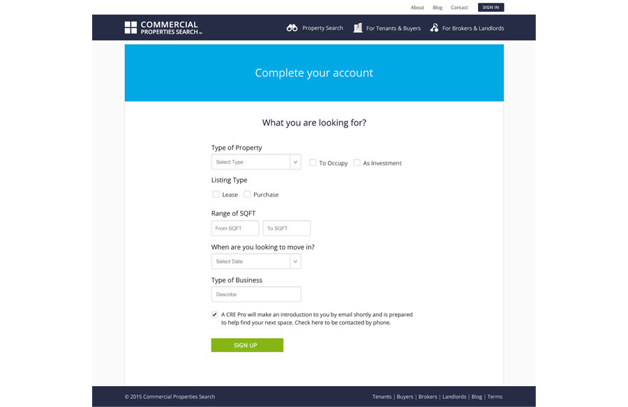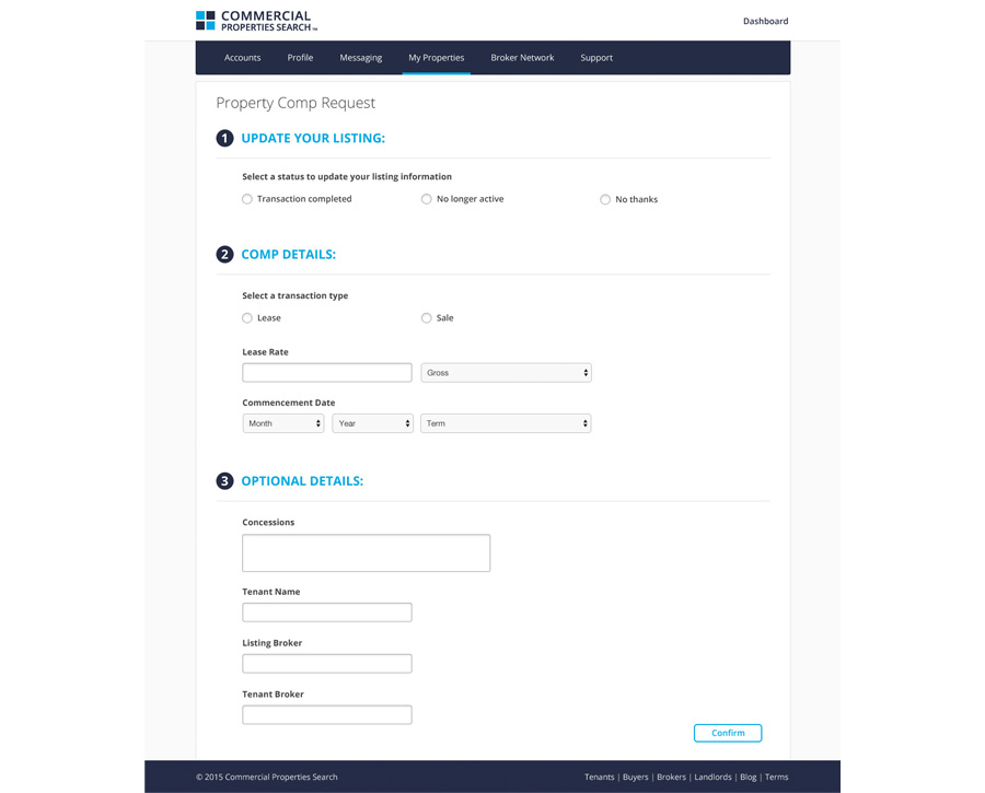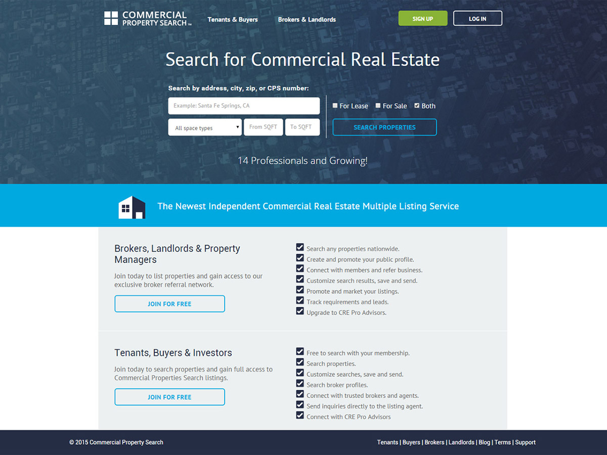 The Commercial Property Search mobile app and website were designed to provide a complete and multiple listing service (MLS) used by brokers and landlords to list properties that are searched for free by tenants and buyers, along with a referral-based platform for brokers and agents to grow their business. Central to the purpose of the application was the desire to make it easy for business owners to search listings across the nation while providing a full service solution that solves property marketing needs for commercial brokers and landlords.